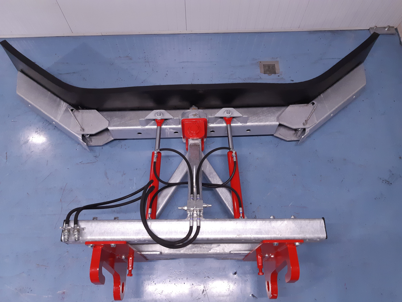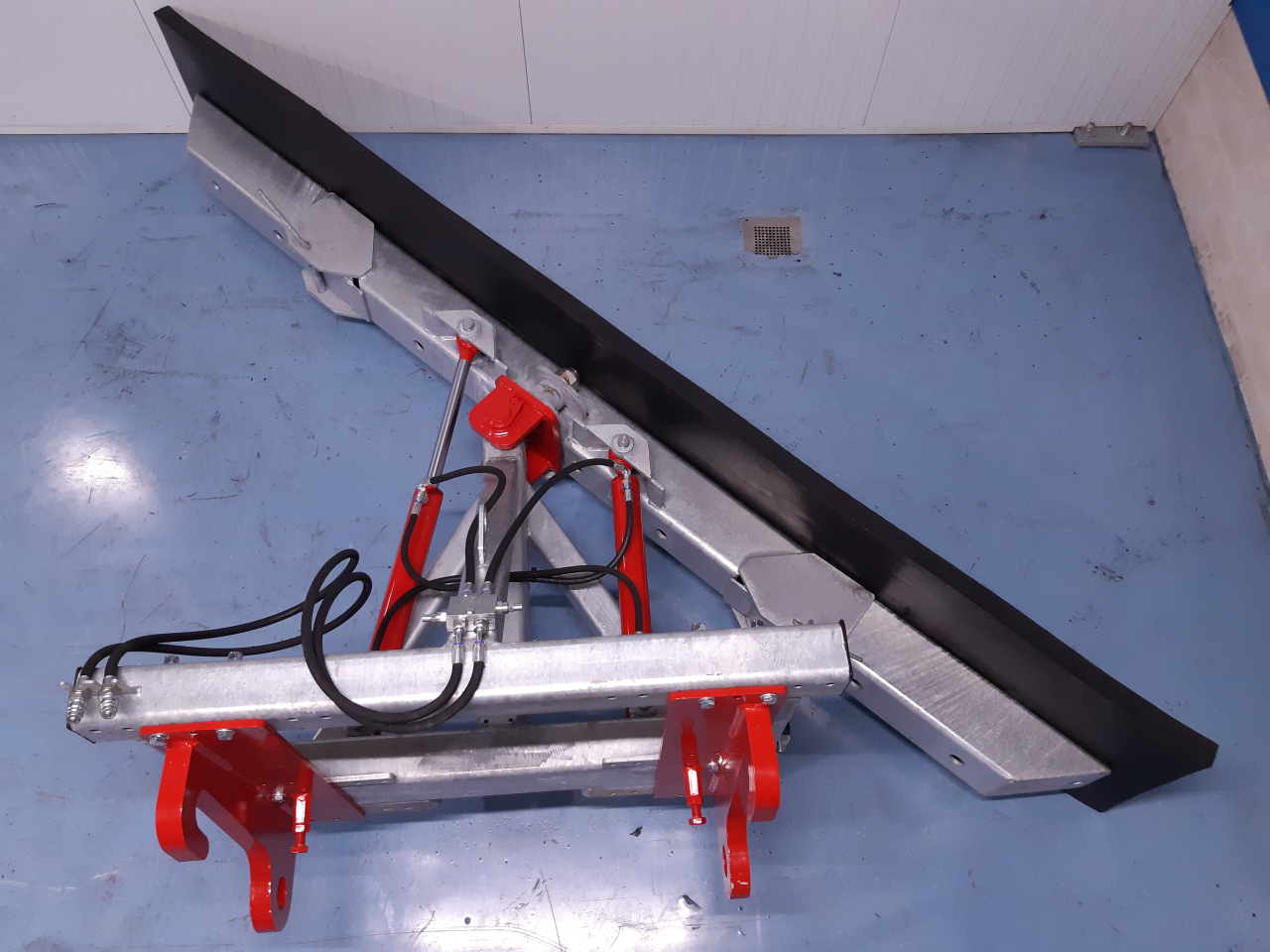 Der Schieber ist so montiert das dieser 15 Grad schwenken kann in Bezug auf den Rahmen. Hierdurch bleibt das Gummi flach am Boden und wird der Schmutz weggeschoben.
