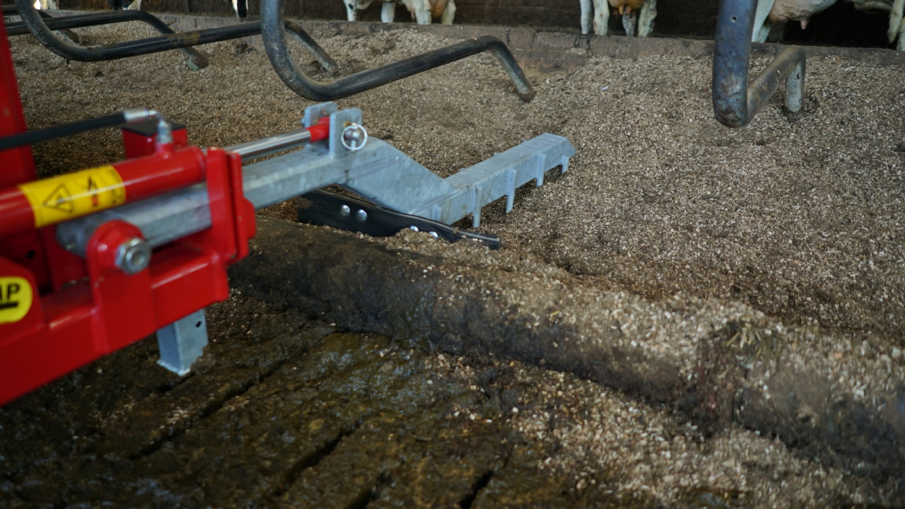 Gummischieber: Es ist möglich um einen Mistschieber zu montieren, womit Sie die Spalten oder den Vorwartehof abschieben können. Während des Schiebens lässt sich die Höhe der Harke verstellen und bleibt der Schieber am Boden. Bei dem DSV ist die Breite vom Gummi 1.800 mm und beim DSVZ 2.400 mm.